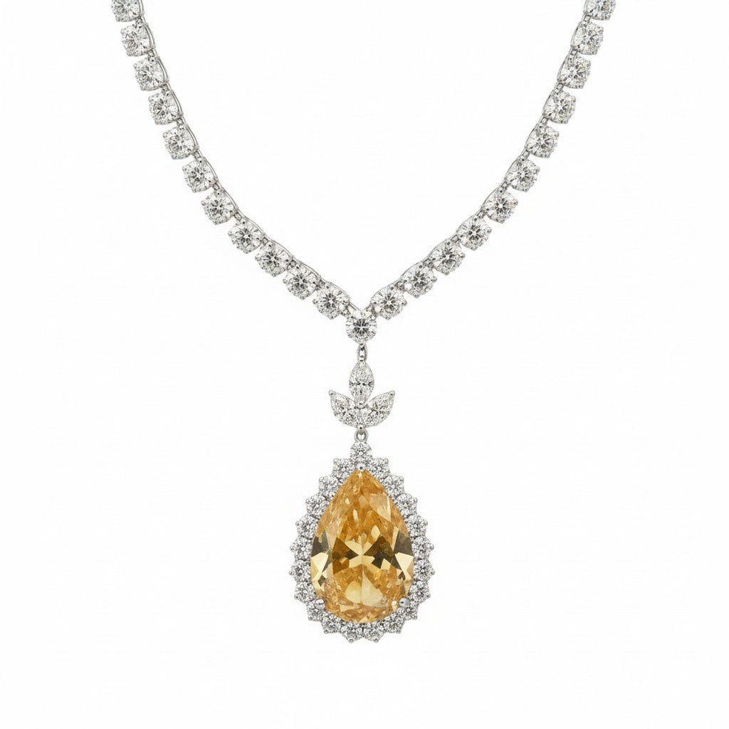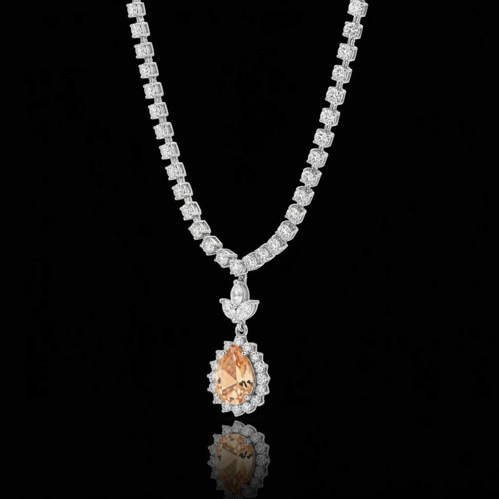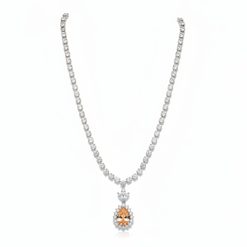 Gracefully luminous and exquisitely composed, our Noore Champagne Radiance Set captures the poetry of modern elegance. A delicate strand of high-grade cubic zirconia forms a seamless river of light, leading to a captivating pear-cut centerpiece framed with precision-set stones. The warm champagne-toned brilliance creates a striking contrast against the cool silver rhodium finish — refined, radiant, unforgettable.