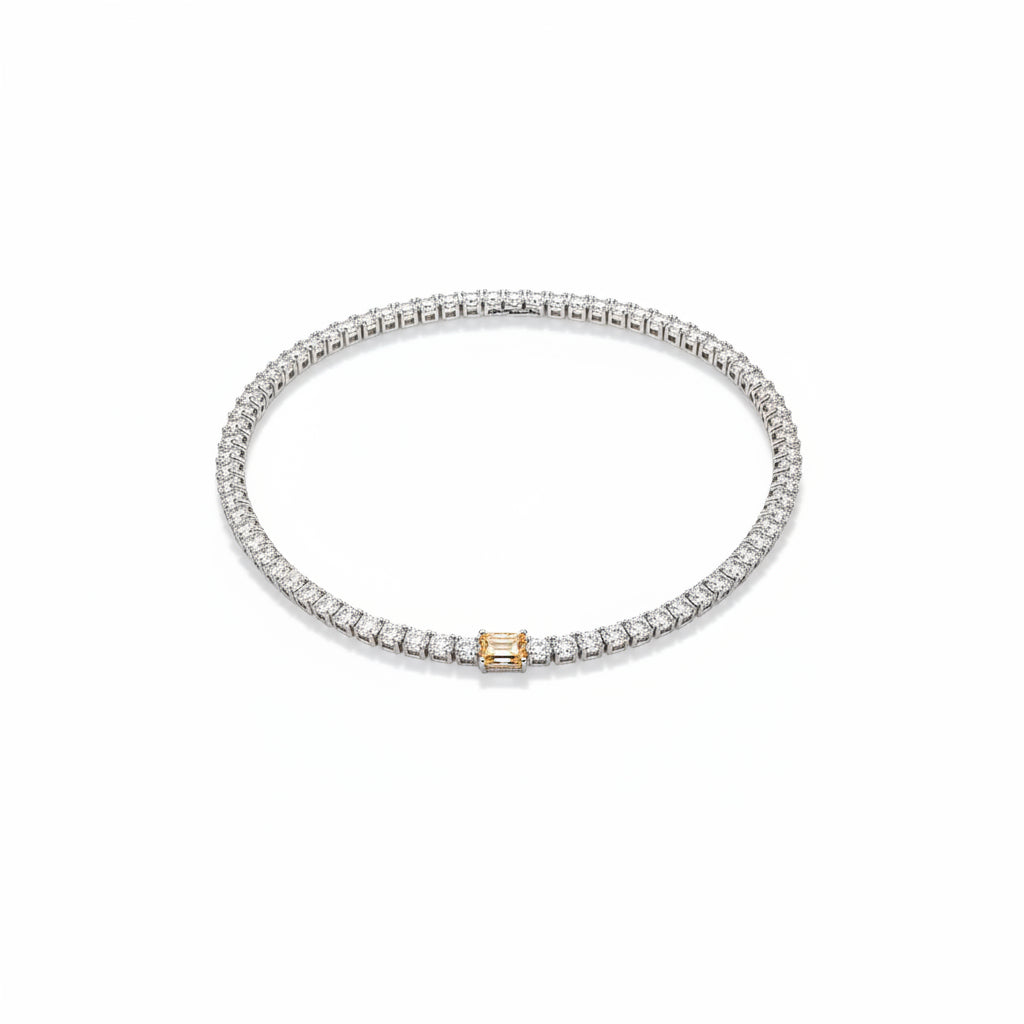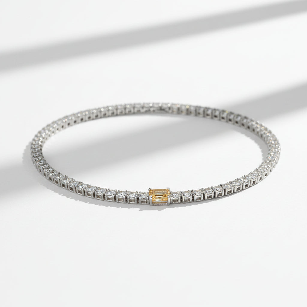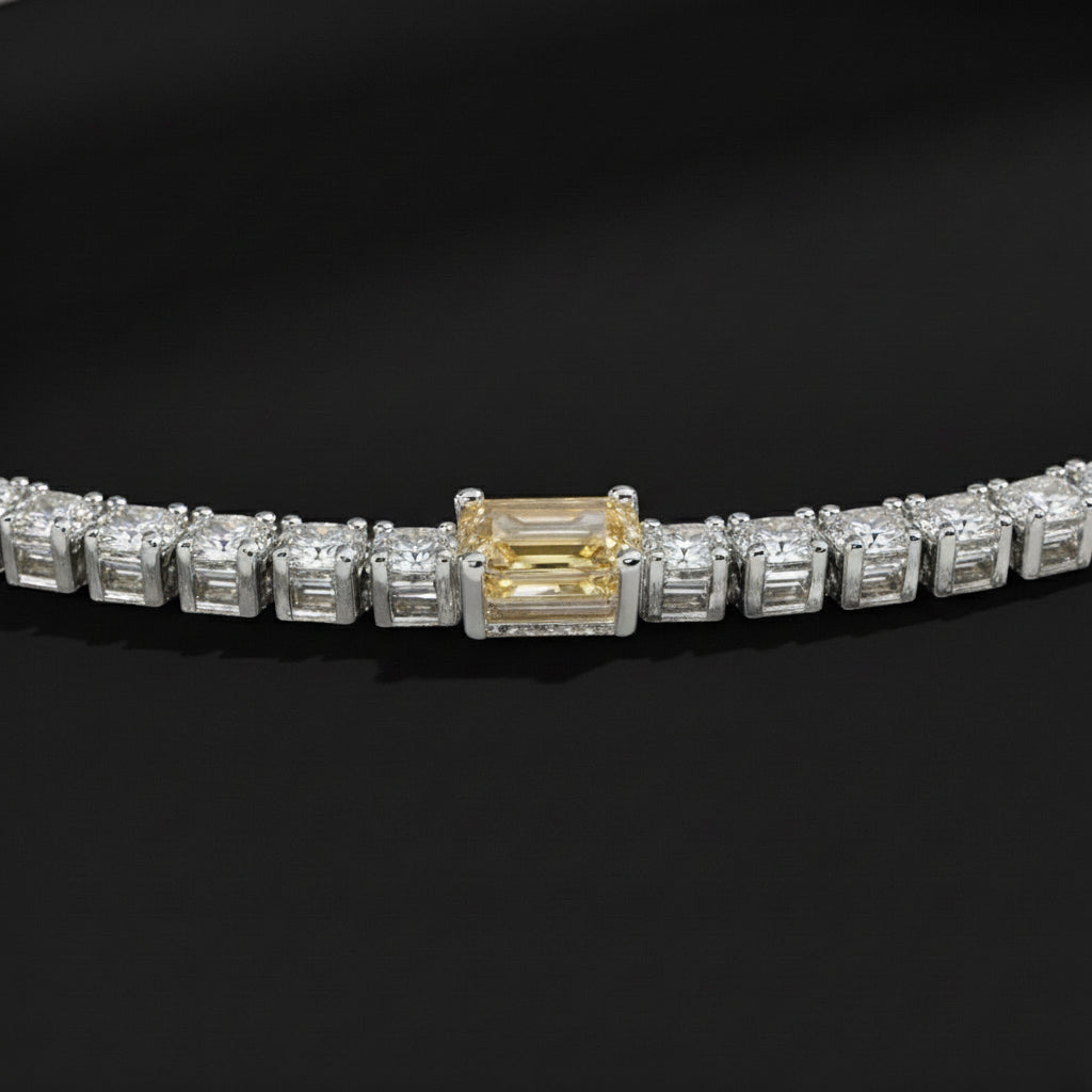 A seamless line of brilliance, the Imperial Strand by SDCreations is a refined celebration of symmetry and light. Designed with meticulously aligned high-grade cubic zirconia stones, this elegant silhouette wraps the neckline in uninterrupted sparkle. At its heart rests a distinctive emerald-cut centerpiece, subtly tinted for depth and dimension — a modern accent that elevates classic luxury.